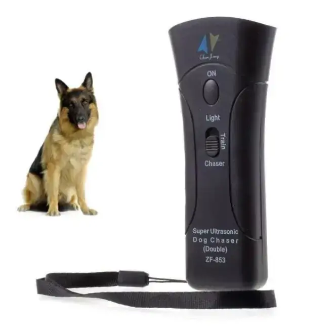 Компактен ултразвуков уред за прогонване на кучета с вграден LED фенер.